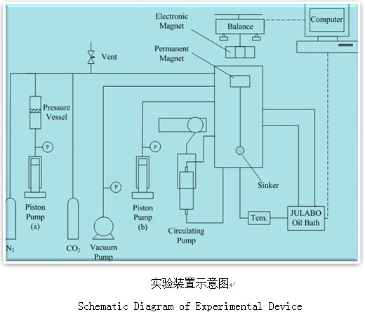 实验系统由磁悬浮天平、气液注入系统、磁力循环泵及数据采集系统组成,测量范围:-20~150℃,UHV~20Mpa,测量精度达到0.01mg.实验系统不仅能进行CO2溶液密度测量试验,而